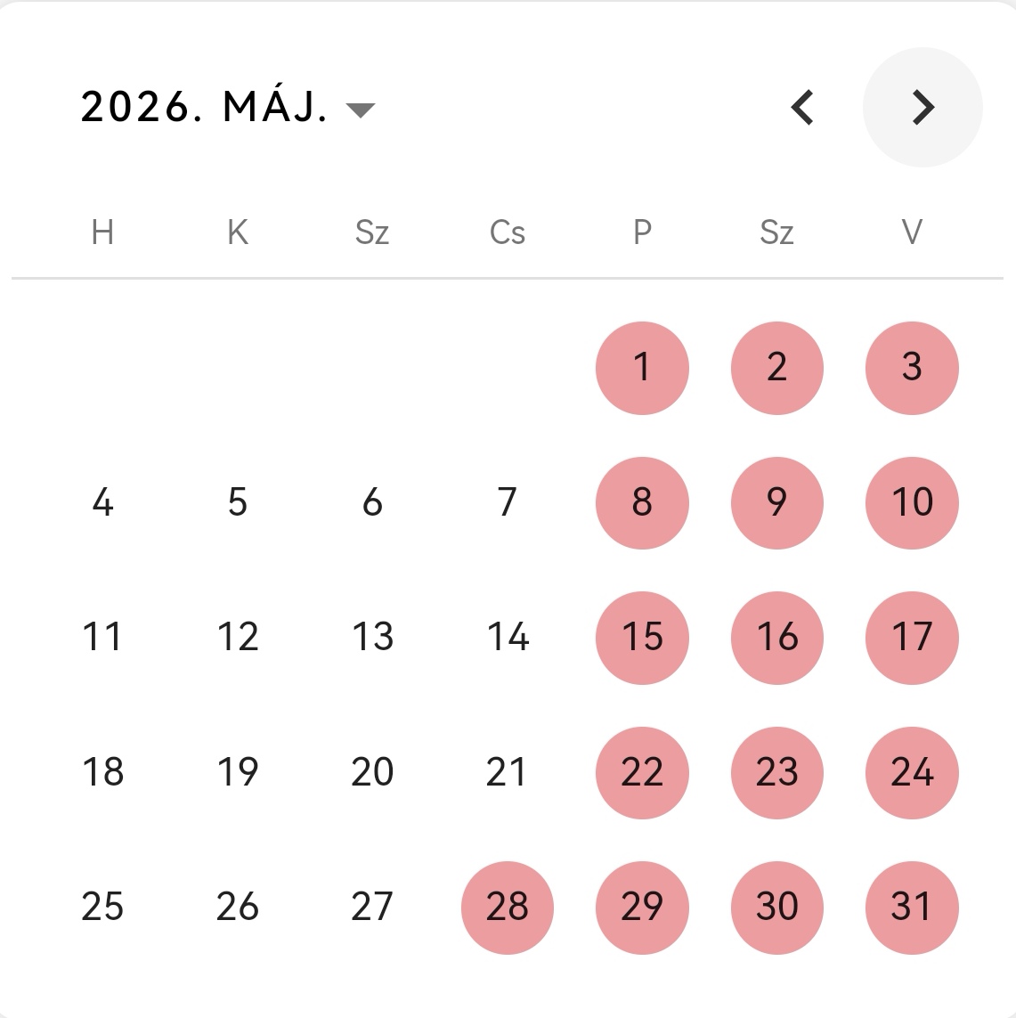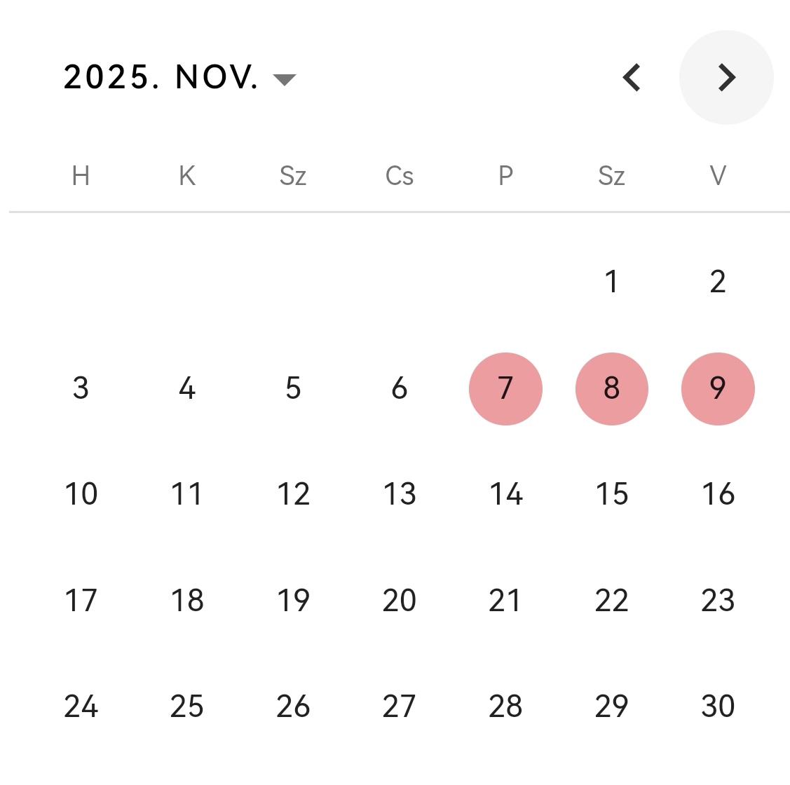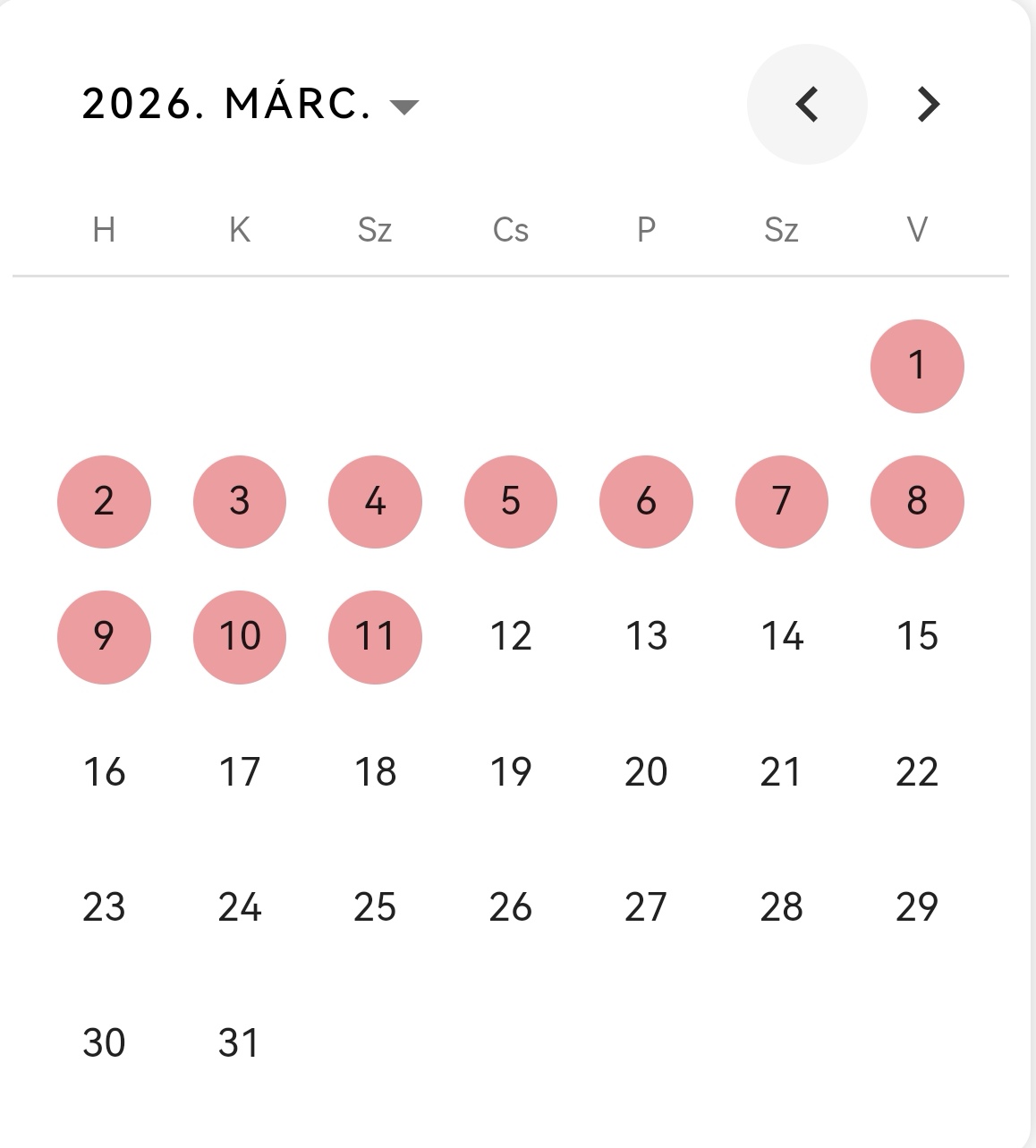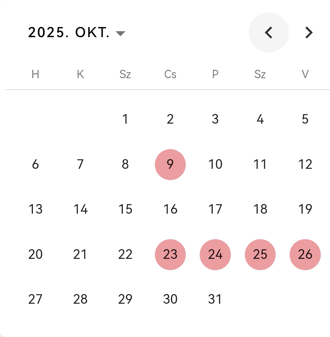 Pirossal jelölt éjszakák a foglalt éjszakákat jelentik.